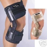 Hinges include a stop to help prevent the knee from hyperextending. Unlike neoprene, material is breathable and cool with less bulk. Wrap style front closures and tension control straps.